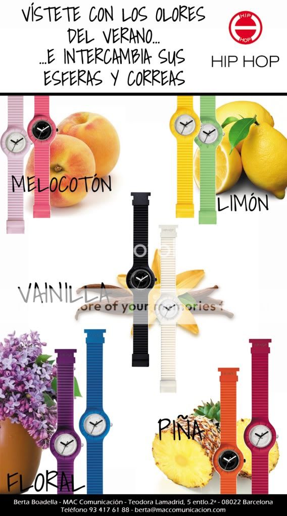 Esta semana recibí un paquete muy original de una agencia de comunicación en el que venía dentro un reloj amarillo en una caja transparente y un limón. Al principio no entendí muy bien lo del limón, pero al abrir la caja y ver el reloj lo comprendí todo. Hip Hop es una marca de relojes que se caracterizan por estar perfumados. Además hay varias fragancias, que dependen de los colores.